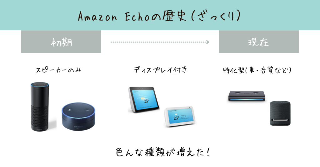 今では車に取り付けるタイプのEcho Auto(エコーオート)や、音質がめちゃいいEcho Studio(エコースタジオ)など特化型のEcho。